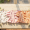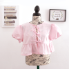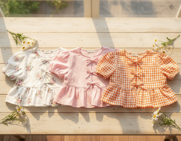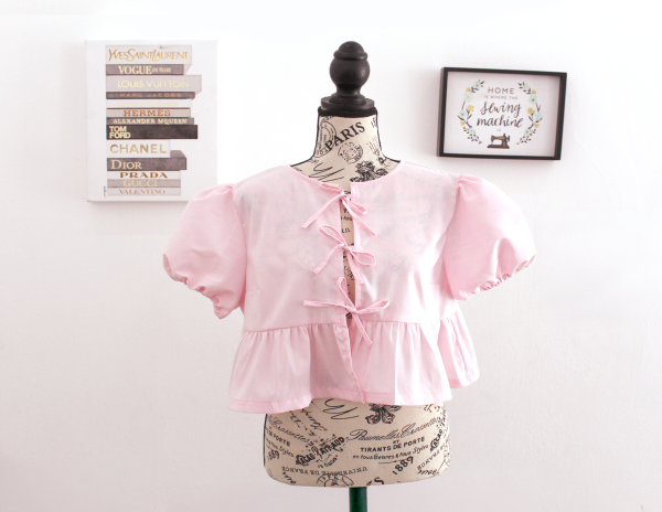 Featuring puff sleeves, a flattering peplum or blouse skirt, and charming front ties, this design blends comfort with timeless style.